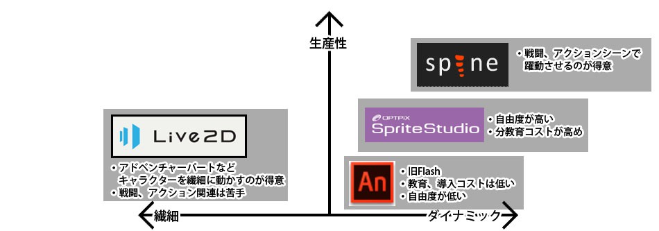 現状ではゲームアニメーション制作のスタンダードとなっており、アドベンチャーパートからバトルパート、エフェクト表現まで幅広く対応が可能。操作性はAdobe animate(旧Flash)に近く、教育コスとも低く抑えられている